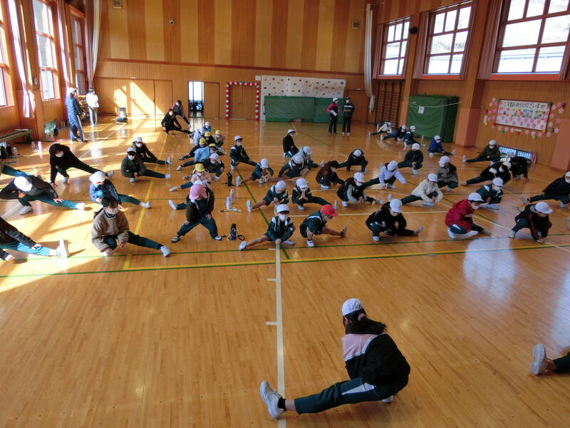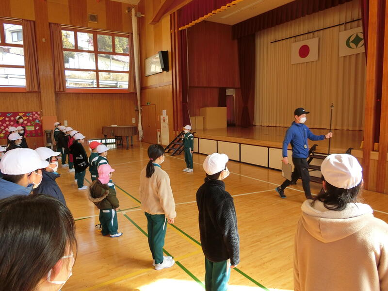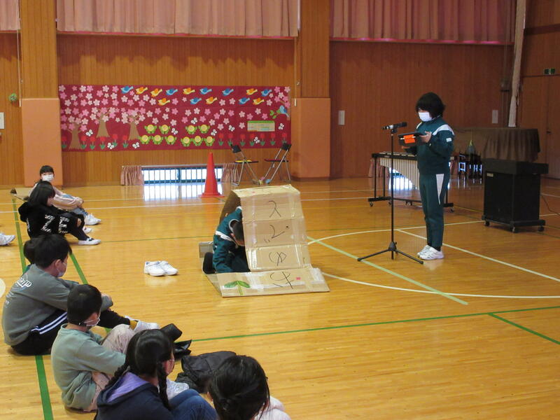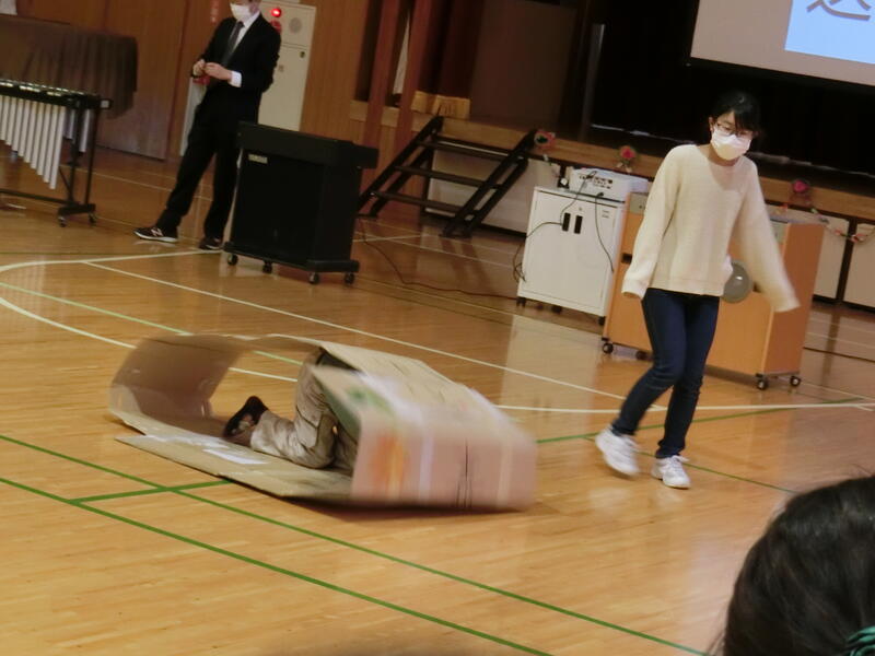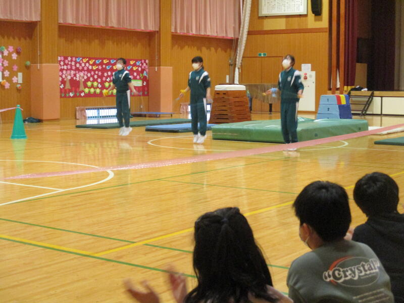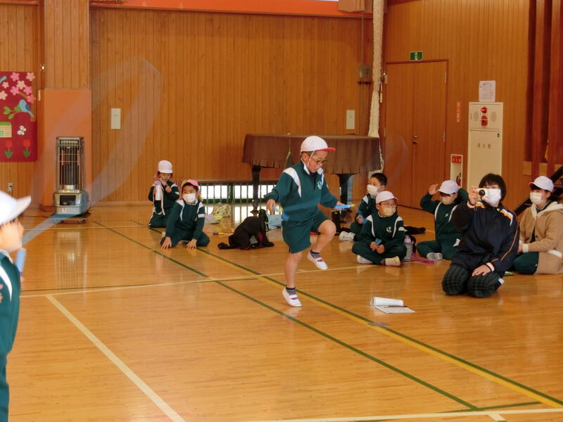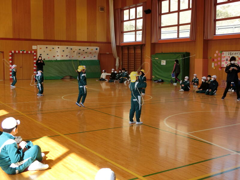 K・T(きずなタイム)で5・6年生の発表がありました。サーカス団に扮した5・6年生が、軽快な音楽に合わせて「跳び箱」や「マット運動」、「なわとび」、「バスケットボールのシュート」を披露しました。5・6年生の躍動感のある動きに会場も大いに盛り上がりました。