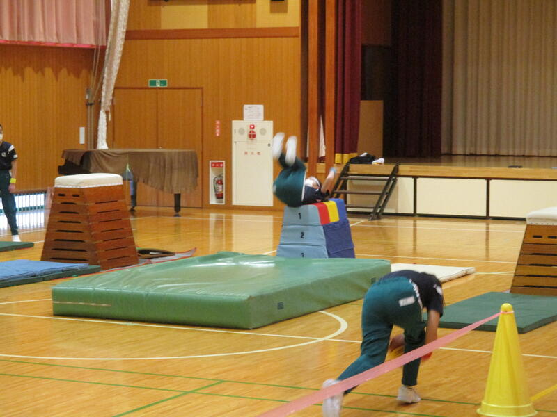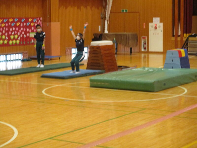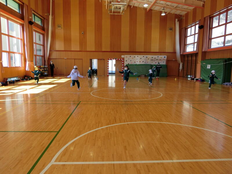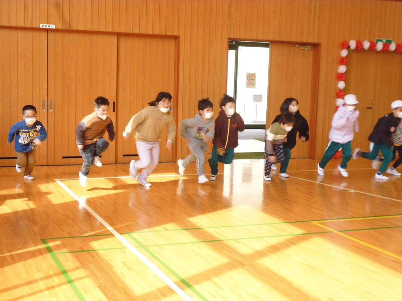 駆け足跳びで縦割り班対抗のリレーをしました。