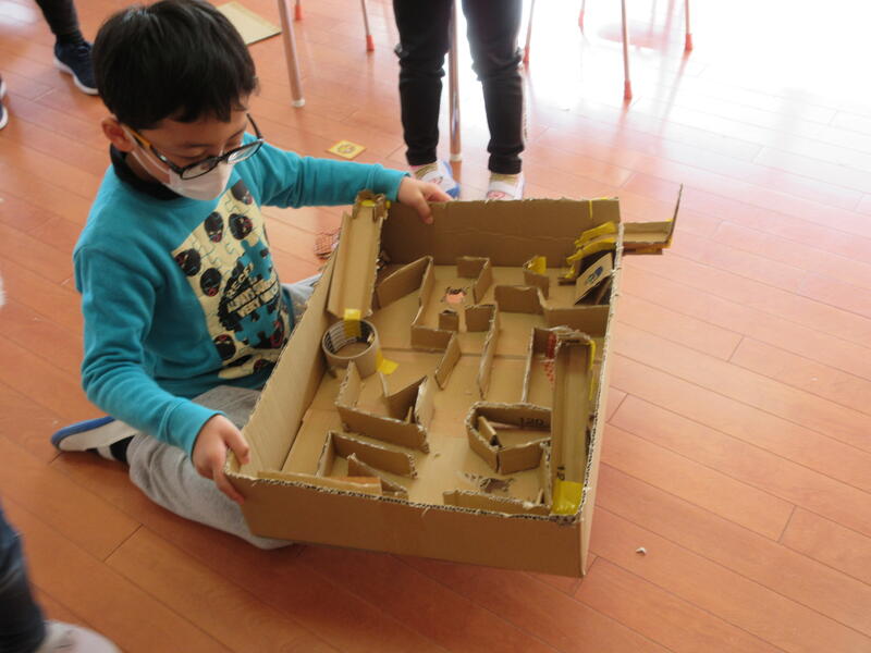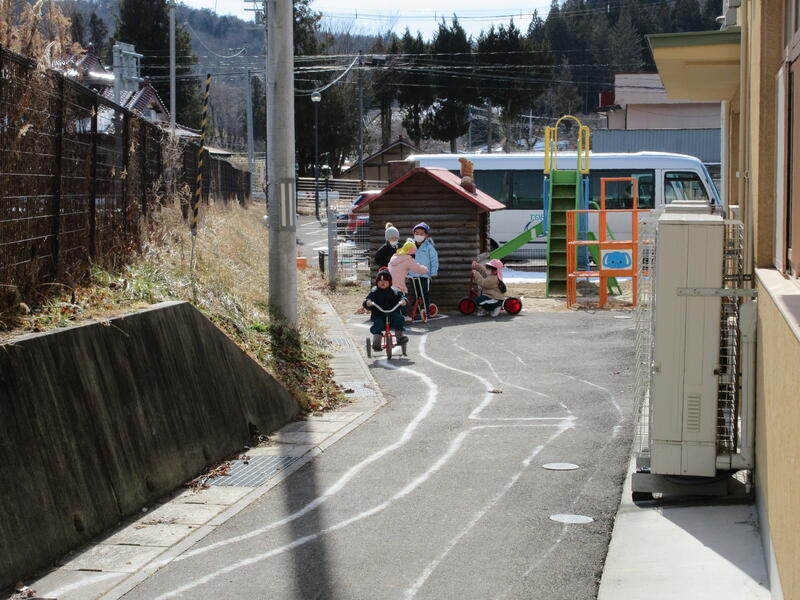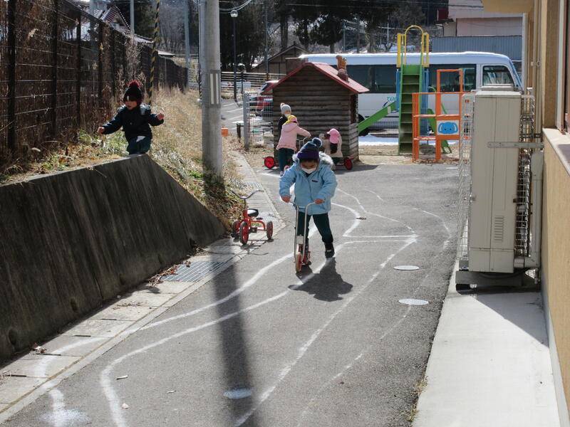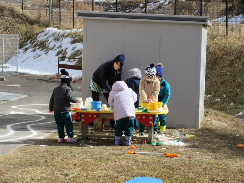 今日の午前中は天気がよかったので、緑幼稚園のお友達は外で元気に遊びました。雪を使ったり、道を描いたりしながら、工夫して楽しく遊ぶことができました。