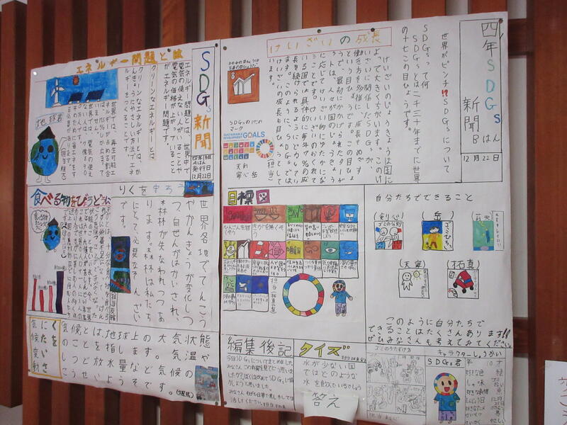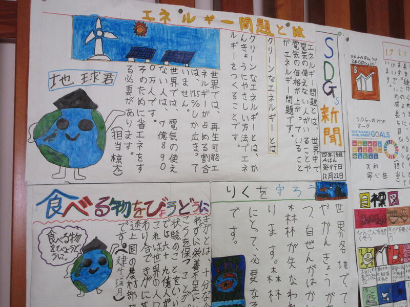 4年生は、総合的な学習の時間でSDGsについて学び、その成果を新聞にまとめました。学級に目標があるように、世界にも共通の目標があります。それは、4年生の学校生活や家庭での生活にも関わっています。自分たちの身近なことと世界を結び付けながら考え、行動していくことの大切さを学んでいます。