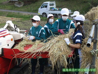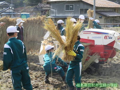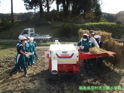 今日、いもほりを終えた5・6年生が田んぼに向かい、脱穀作業を行いました。学校支援ボランティアの方からご指導をいただいて、手際よく作業を進めることができました。収穫したお米は、12日の収穫祭にて、全校生でいただきます。緑の指導員の方にお世話になり、精米をしていただきます。ありがとうございます。