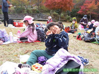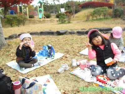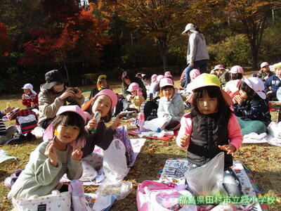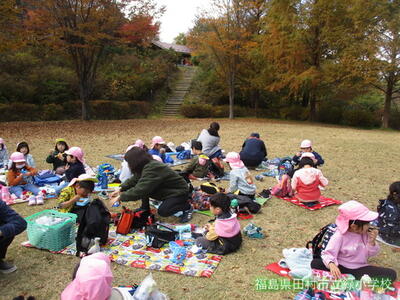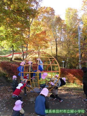 今日、緑幼稚園のみんなが、芦沢幼稚園、船引南幼稚園のお友達と一緒に、児童公園へ交流遠足に行きました。お天気が良く、紅葉がとてもきれいでした。