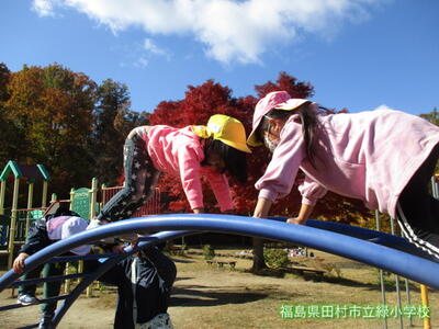 緑小学校は、全校生50人ほどの小規模校です。1年生から6年生までみんな仲が良く、天気のいい日には、みんなで元気に校庭で遊んでいます。学年に関係なく、一緒に鬼ごっこをしたりボール蹴りや一輪車をしています。鉄棒や雲梯で遊ぶお友達もいます。また、緑幼稚園が併設されており、幼・小連携のもと教育活動に取り組んでいます。