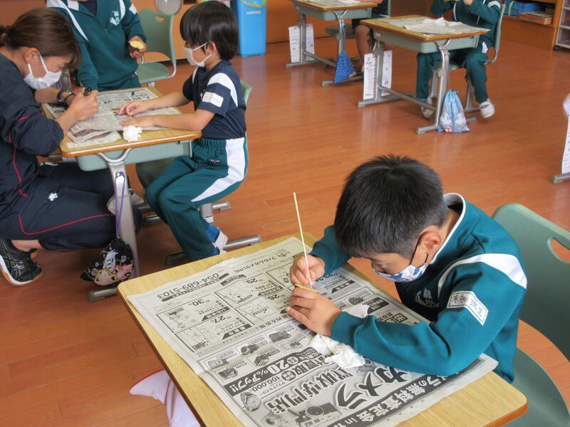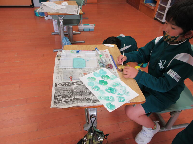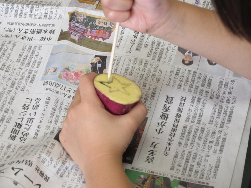 1年生は、先日収穫したサツマイモを使って、芋スタンプ作りに取り組みました。芋の断面に思い思いの形を掘り、絵の具をつけて、スタンプの完成です。