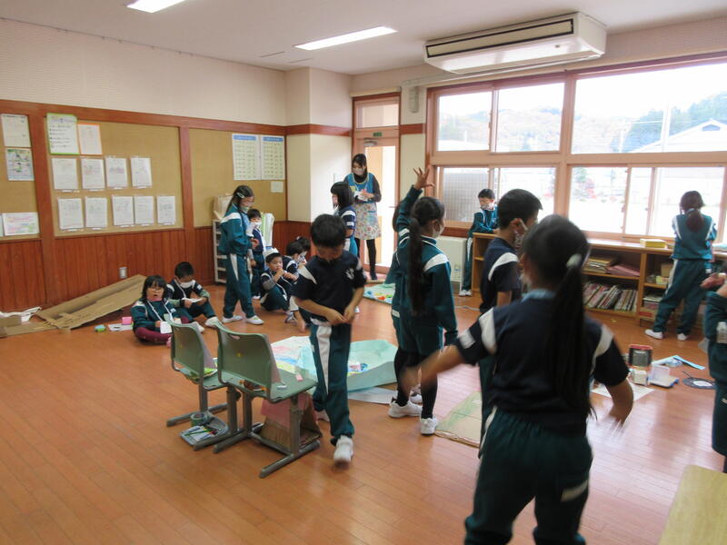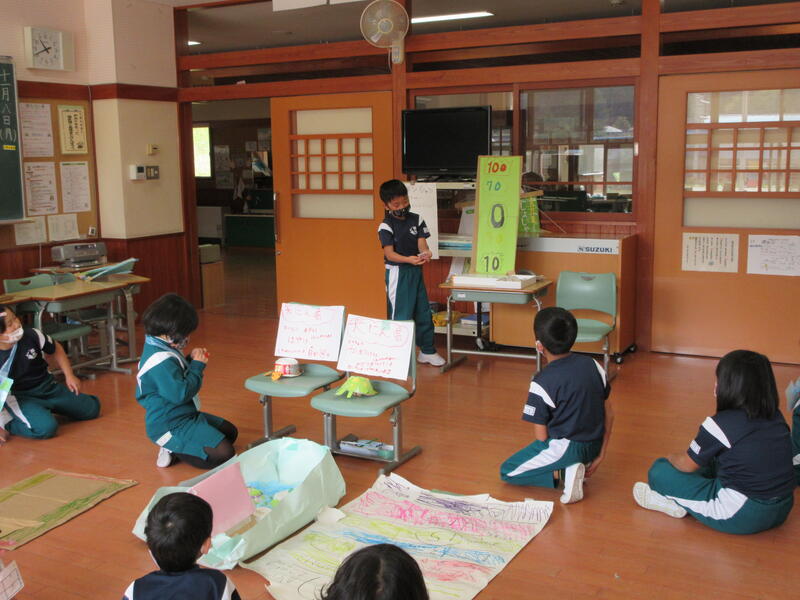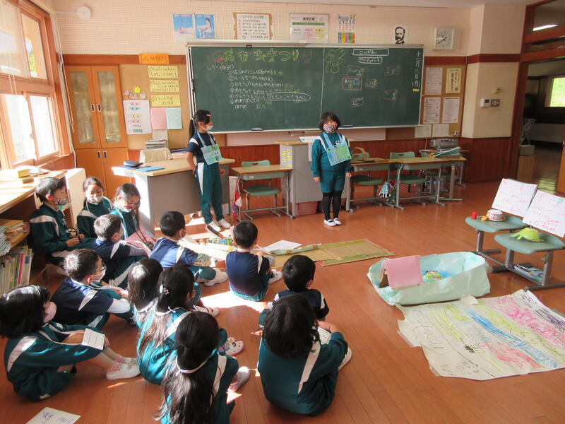2年生は、緑幼稚園のお友達を迎えて「おもちゃまつり」を開きました。いろいろなおもちゃを作り、その遊び方を園児に分かりやすく説明していました。緑幼稚園のお友達も、2年生が作ったおもちゃで楽しく遊び、感想もしっかり言えました。