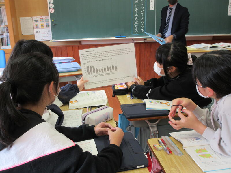 <授業の最初では、資料から「読み取れること」と「効果」について話し合います。>