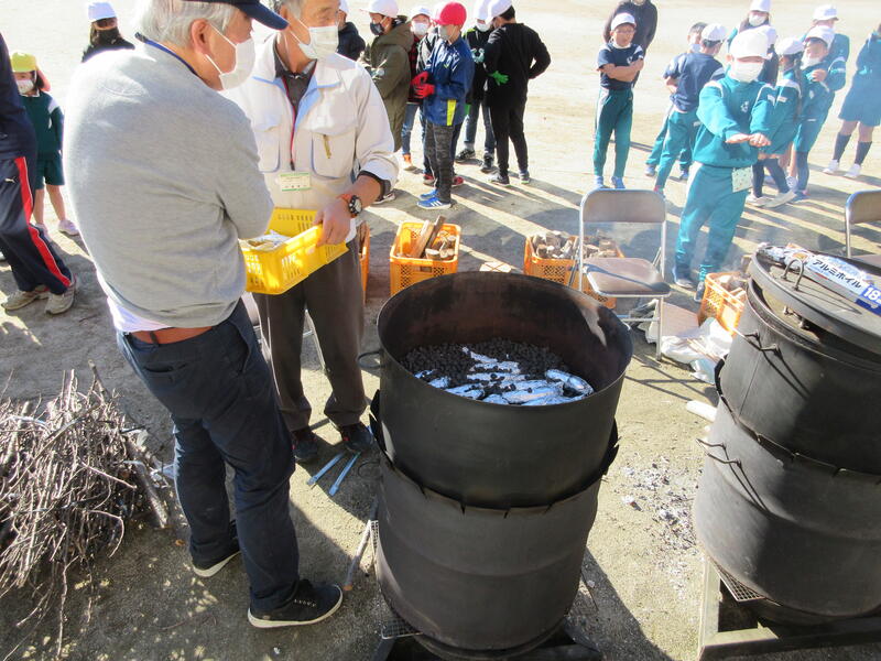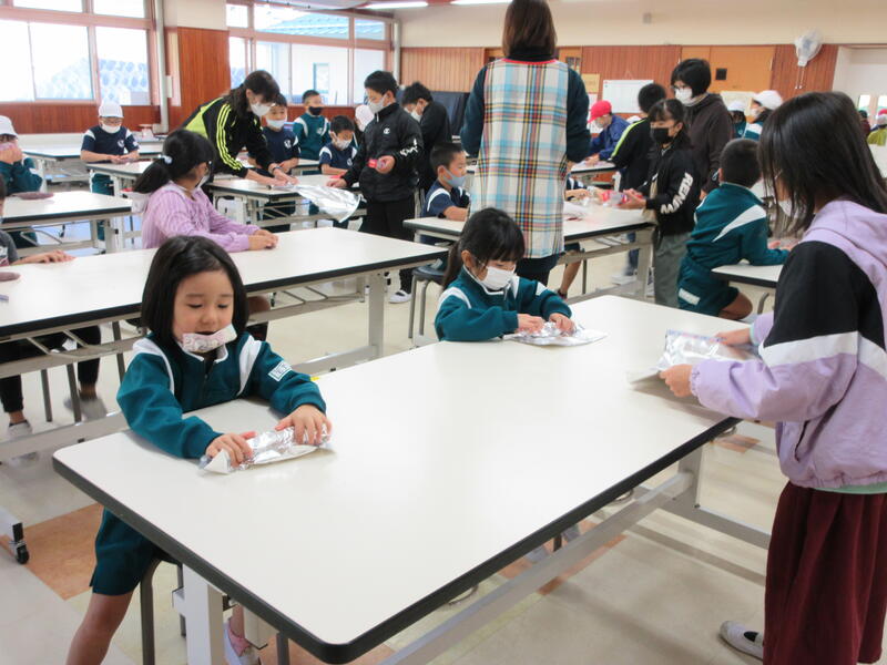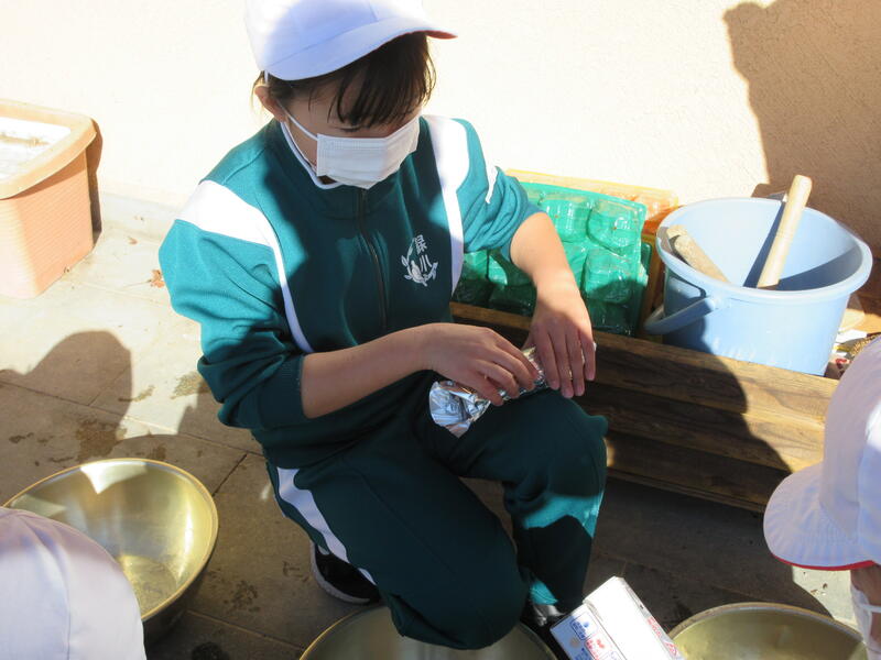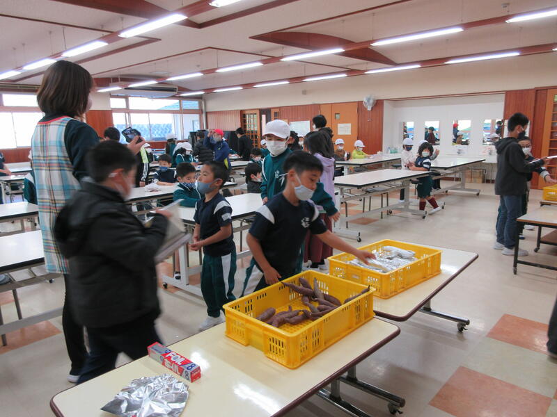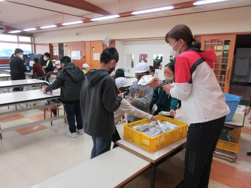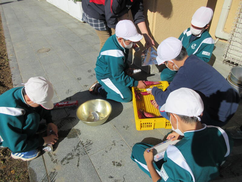 <1~4年生が協力してサツマイモをアルミホイルで包みます>