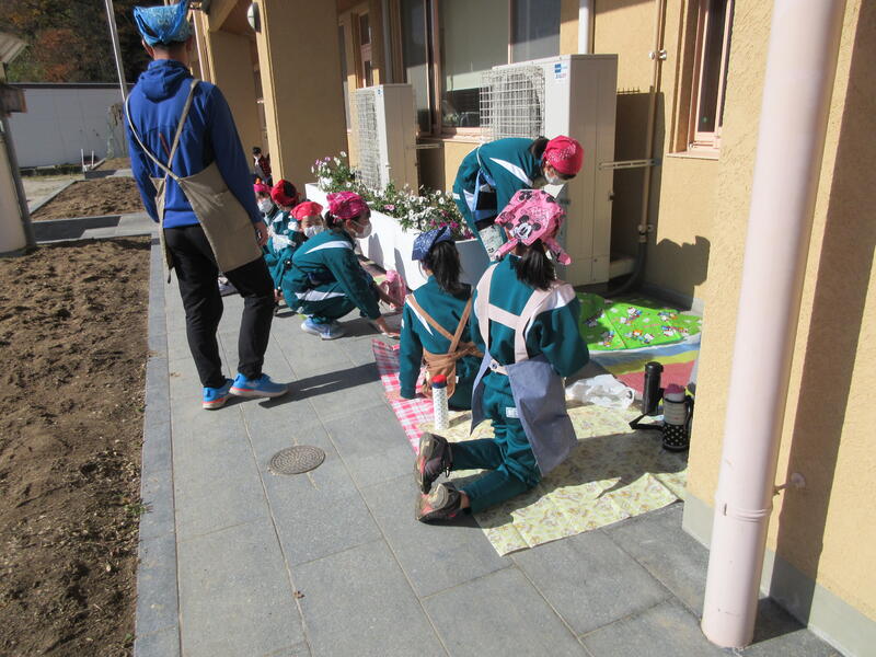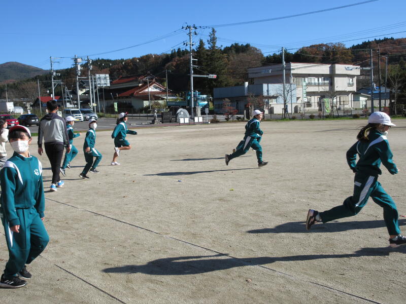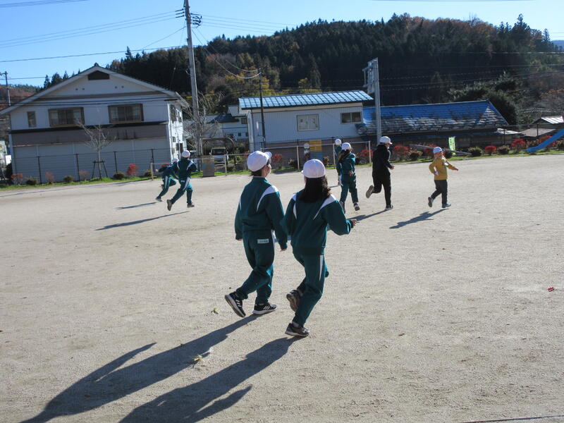 きずなタイムで縦割り班活動をしました。班ごとに話し合って何をするかを決めました。校庭で鬼ごっこをしていた班は、青空の下で元気一杯楽しんでいました。