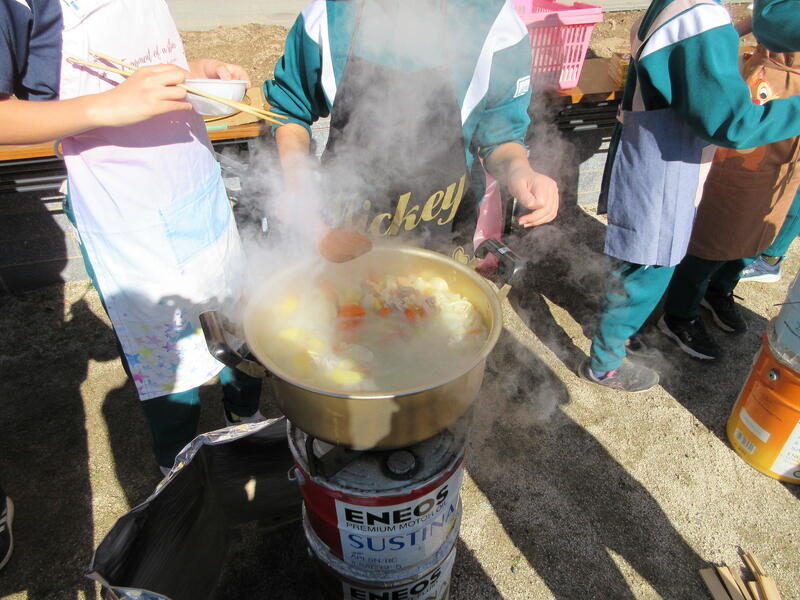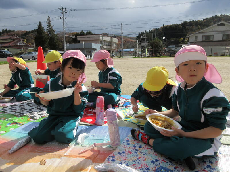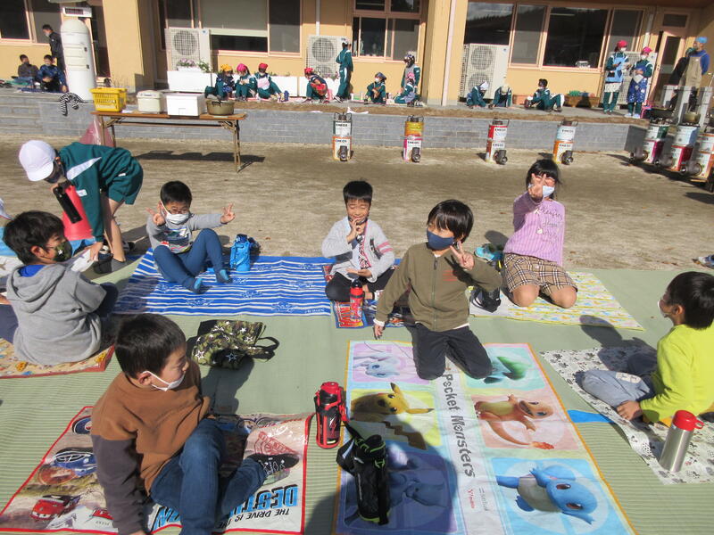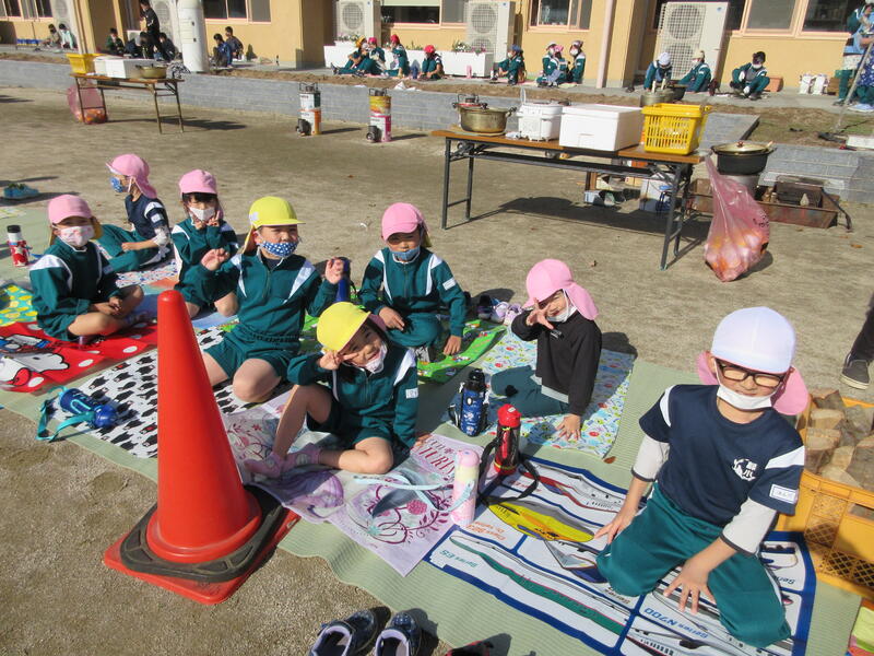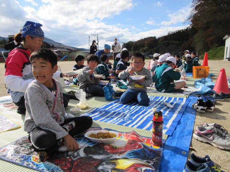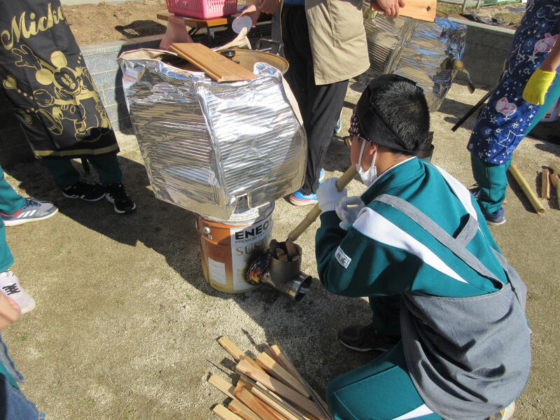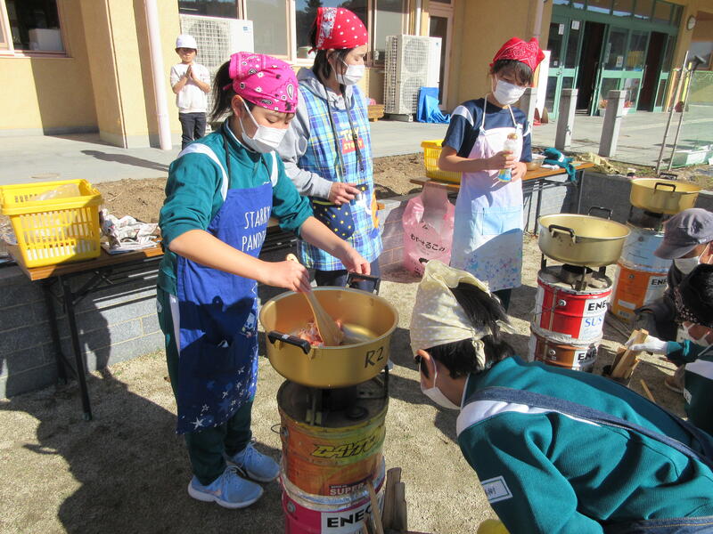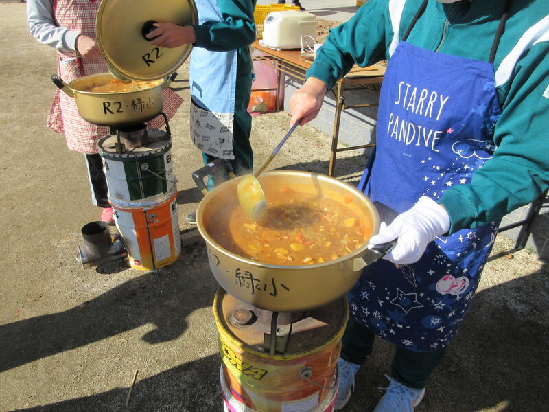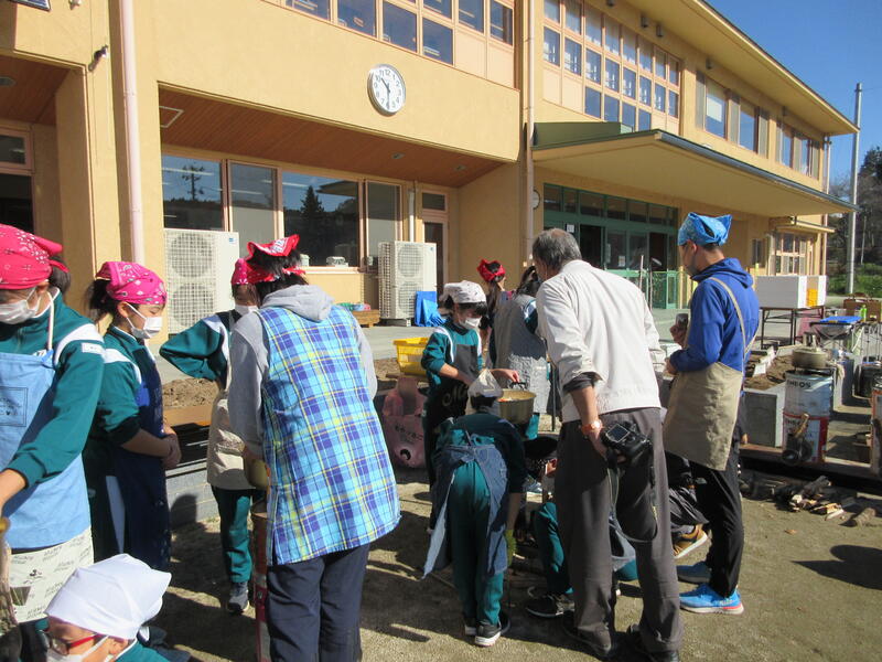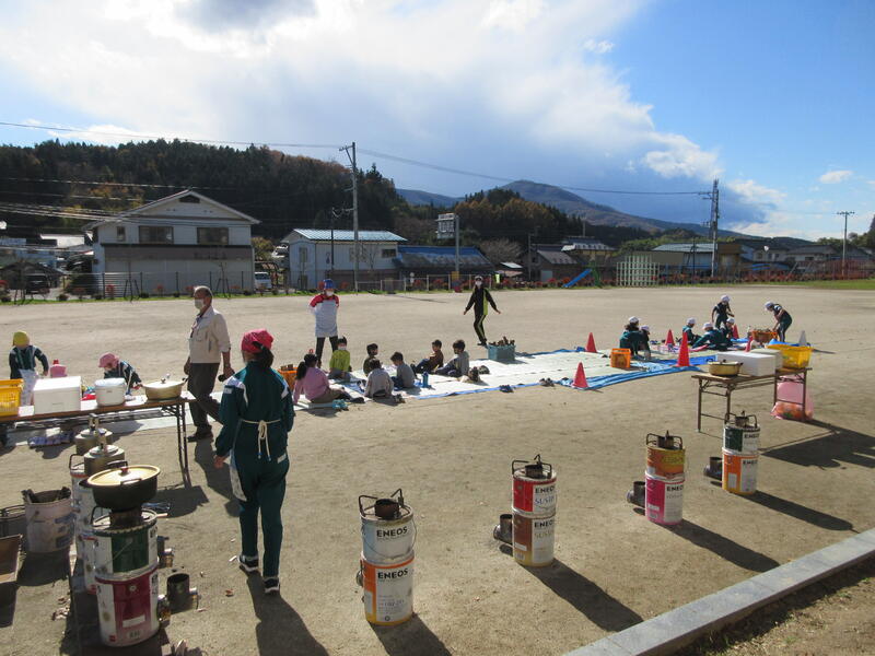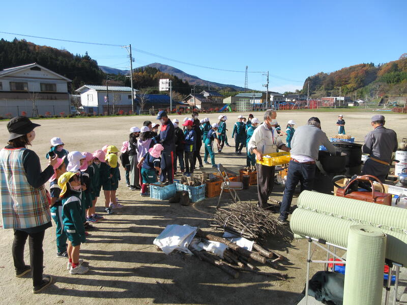 今日は、緑小学校・緑幼稚園の収穫祭です。自分たちが育てたさつまいもや米を使って、焼き芋やカレーを作ります。 「育てて、食べる」貴重な体験学習のまとめでもあります。調理に必要な道具は全て手作りです。子どもたちは、興味津々です。本日お世話になるのはコーディネーターの伊藤さんや佐藤さん、緑の指導員の佐藤さんです。