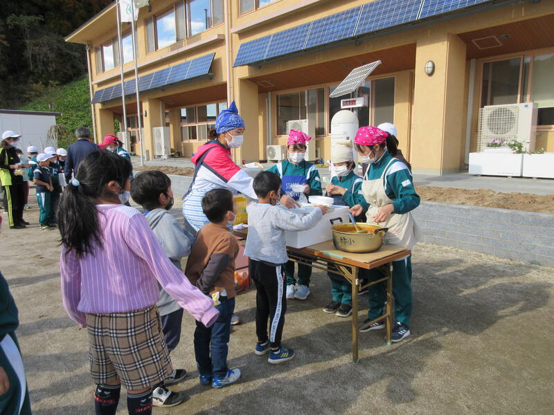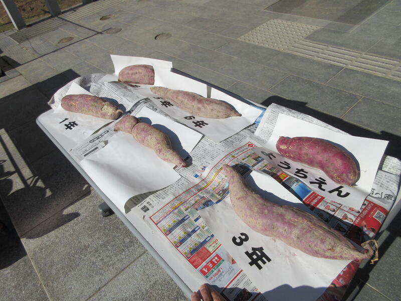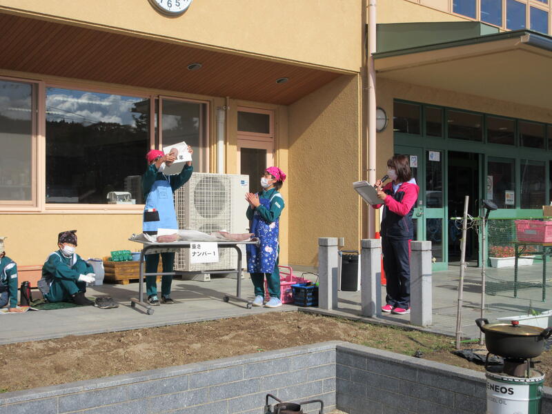 配膳の前に、始まりの会をしました。会の最初に、学年ごとに収穫したサツマイモの重さナンバー1の発表がありました。ナンバー1は、3年生の1080gでした。