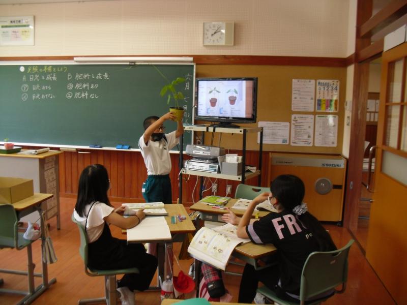 5年生は、理科で、植物の成長に必要なものは何かについて学習していました。温度や養分、日光など、予想したものが本当にあっているのか、確かめるための実験も大事になってきます。どんな実験をすれば正しい結果が得られるか、実験方法を考え、実際に実験し、予想を検証していきます。