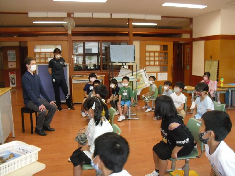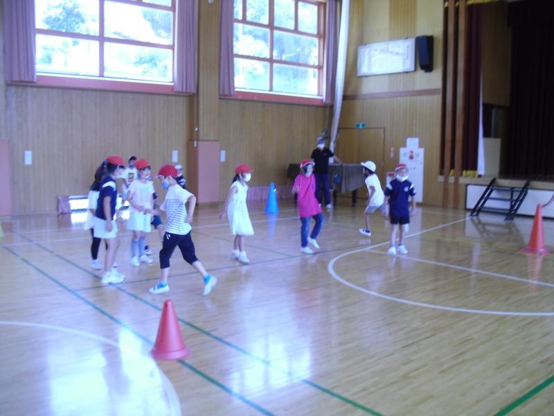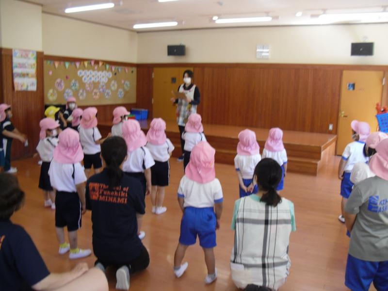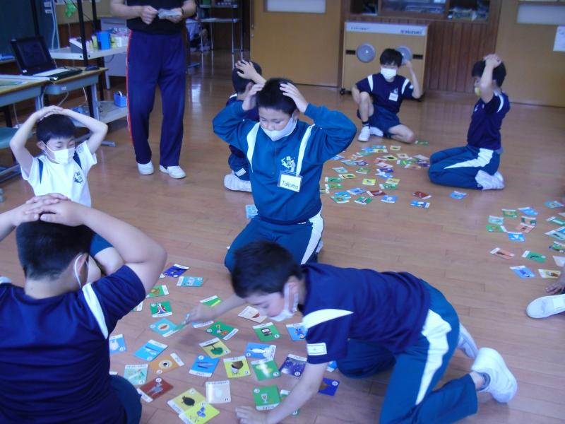 今日の英語学習の様子です。子どもたちは、ゲームの中で楽しく英語を学んでいます。幼稚園の子どもたちも体を使って楽しく英語を学んでいます。