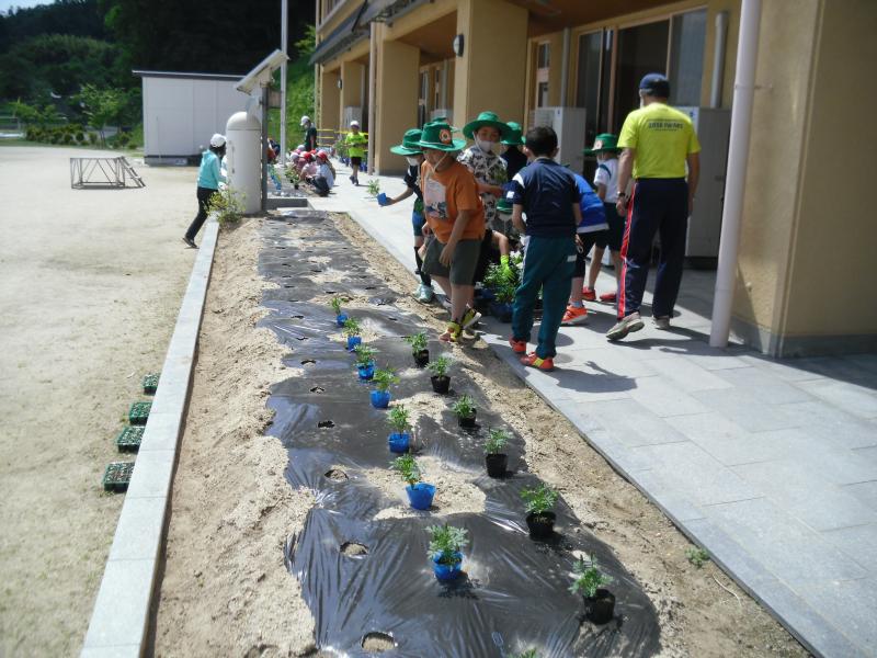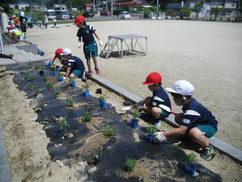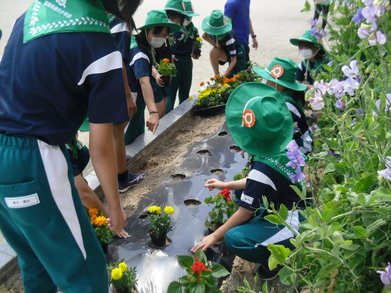 緑の時間で花植えをしました。各学年の花壇へ花を植えたり、過日頂いた人権の花を植えたりしました。これから大切に育てていきます。花壇の花や人権の花を育てながら、生命を大切に思う気持ちや相手を思いやる心を一緒に育てていきたいと思います。