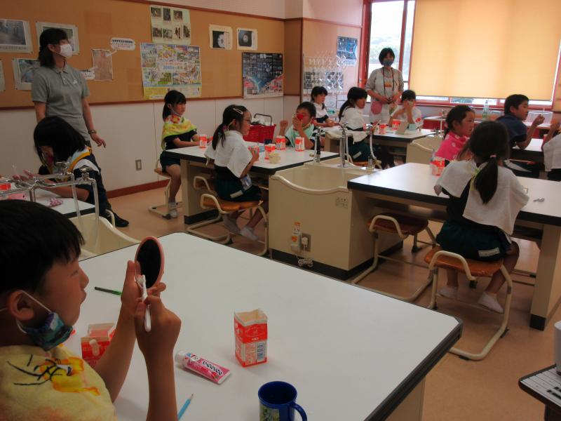 2021年6月14日 14時13分2・3年生の歯科指導の様子です。虫歯はどうしてできるのか?、正しい歯磨きの仕方は?、子どもたちは、中山先生の説明と実際の歯磨きを通して正しく理解していました。4年生、5・6年生も発達段階に合った内容で、歯科指導を行いました。