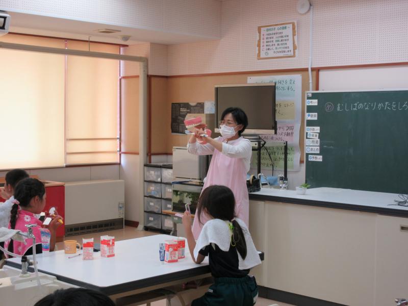 2・3年生の歯科指導の様子です。虫歯はどうしてできるのか?、正しい歯磨きの仕方は?、子どもたちは、中山先生の説明と実際の歯磨きを通して正しく理解していました。4年生、5・6年生も発達段階に合った内容で、歯科指導を行いました。