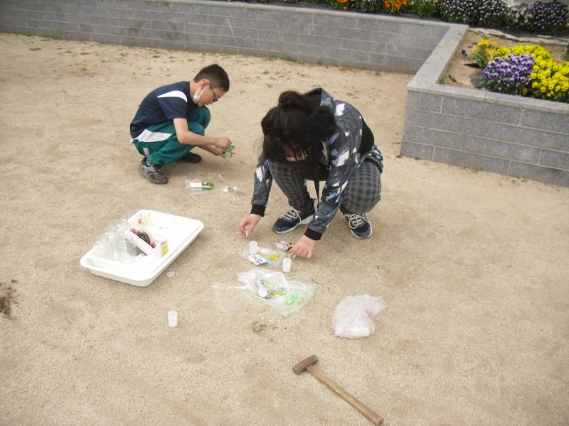 科学クラブでは、入浴剤を使ったバブロケットづくりに取り組みました。フィルムケースに水を入れ、入浴剤を入れてよく振るとケースのふたがポーンと飛びます。子どもたちは、興味津々、実験に取り組んでいました。