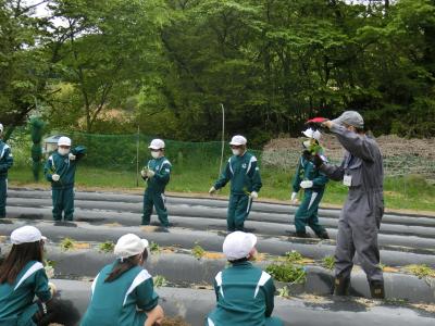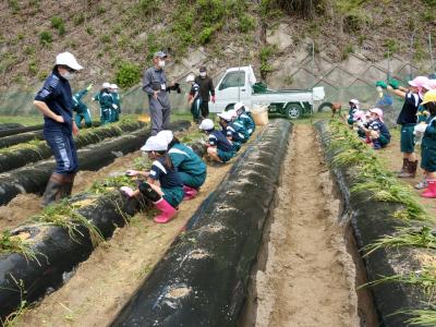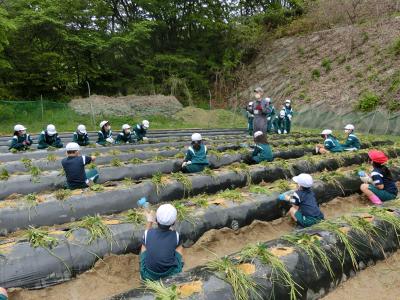 本校では、生活科、総合的な学習の時間の中で、全校共通の環境学習(絆の桜の世話、サツマイモの苗植えと収穫、森林学習、収穫祭)に取り組んでいます。昨日は、サツマイモの苗植えをしました。緑の指導員のご指導のもと、苗の植え方や世話の仕方を学びました。これからも豊かな体験活動を通して、地域の環境を守ることや食料の大切さを学ばせ、地域愛や感謝の心を育てていきたいと思います。