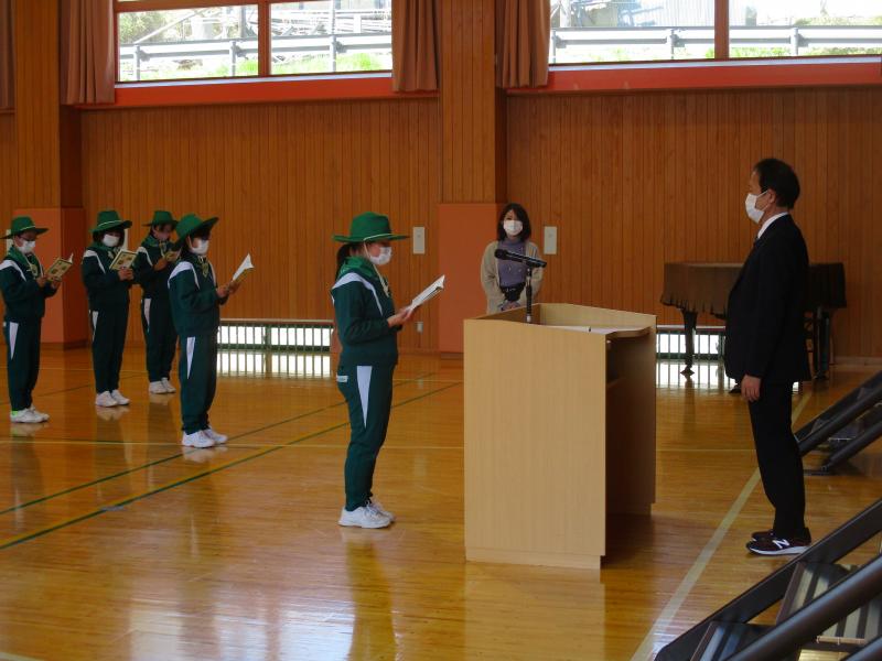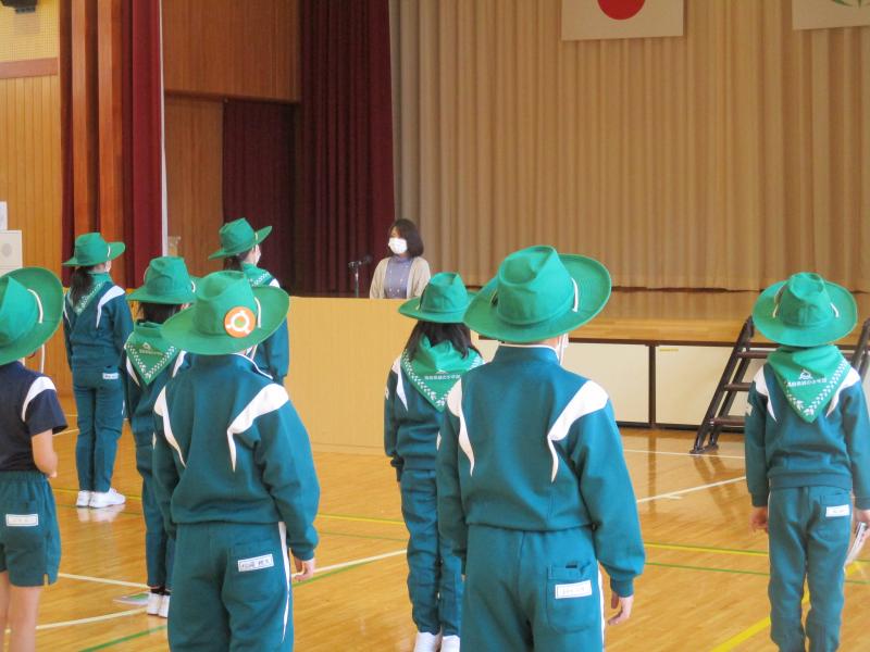 今日のきずなタイムに緑の少年団の結団式を行いました。はじめに、育成会の渡邉会長さんからお話をいただきました。誓いの言葉では、団長から、緑に親しむこと、緑を守り育てること、地域を愛し、豊かな心を育てること等についての発表がありました。緑小学校のみどりの少年団これからの活躍が楽しみです。