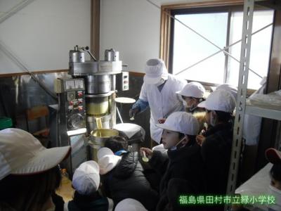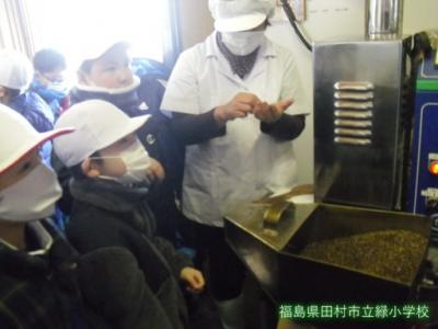 今日、3・4年生が船引北部搾油所に見学に行きました。自分たちが育てたエゴマを搾油する様子を、見せていただきました。
