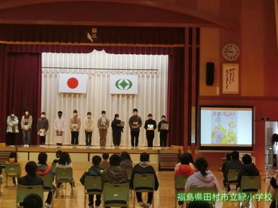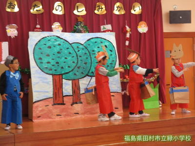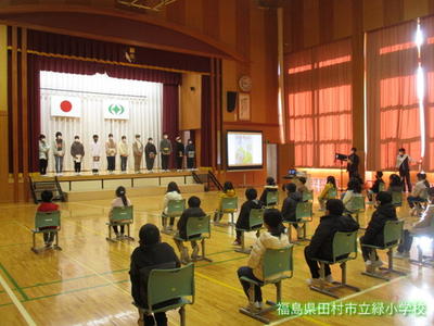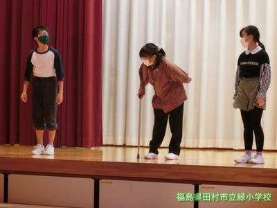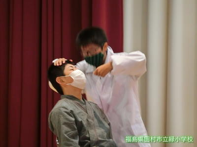 今日、5・6年生が今年度の緑っ子フェスタに向けて練習してきた劇を、全校生に披露しました。5・6年生は、11日(金)の授業参観で、保護者の方々の前でも発表します。