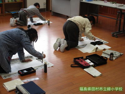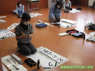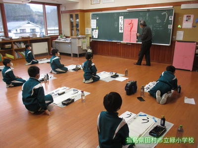 今日、講師の先生にご来校いただき、書初めの指導をしていただきました。みんなは、講師の先生の話をよく聞いて、どの学年も真剣な態度で、書初めの練習をしました。