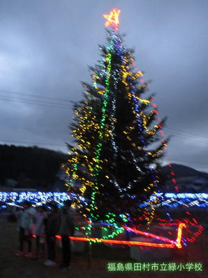 授業参観、学級懇談会の後、校庭に出て、児童・園児、保護者のみなさんで、イルミネーション点灯式を行いました。もみの木の設置に協力してくださった皆様もおよびして、元気にカウントダウンをしました。