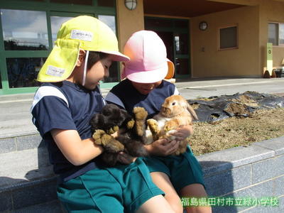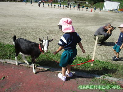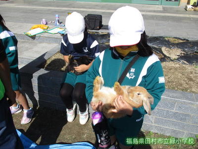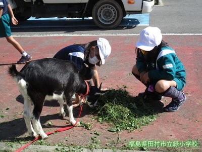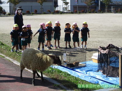 緑幼稚園、緑小学校に、たくさんの動物たちがやってきました。地域に、やぎ・ひつじ・うさぎ・ひよこなどの動物を飼っている方がおり、緑幼稚園と緑小学校1、2年生のお友達に、動物たちを見せに来てくれました。