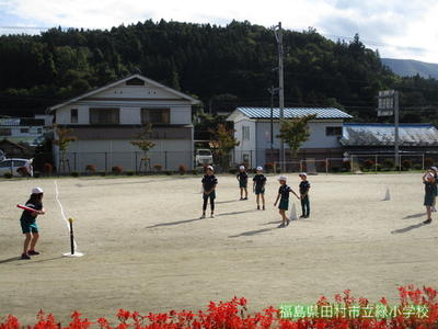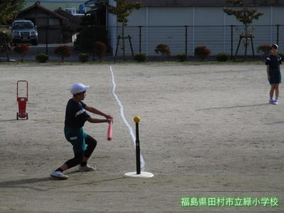 校庭から、4年生の楽しそうな声が聞こえてきたので、ちょっとのぞいてみました。体育の授業のようです。みんなで、ティーボールをやっていました。