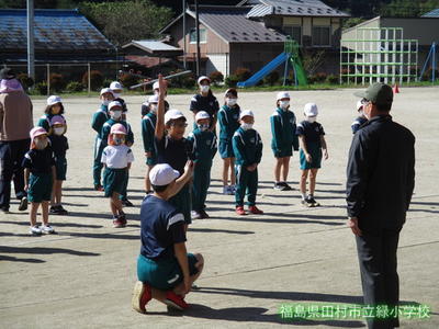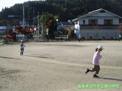緑小学校は、全校生50人ほどの小規模校です。1年生から6年生までみんな仲が良く、天気のいい日には、みんなで元気に校庭で遊んでいます。学年に関係なく、一緒に鬼ごっこをしたりボール蹴りや一輪車をしています。鉄棒や雲梯で遊ぶお友達もいます。また、緑幼稚園が併設されており、幼・小連携のもと教育活動に取り組んでいます。