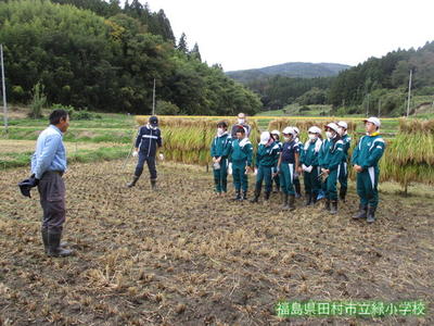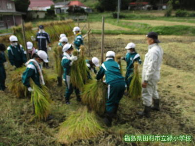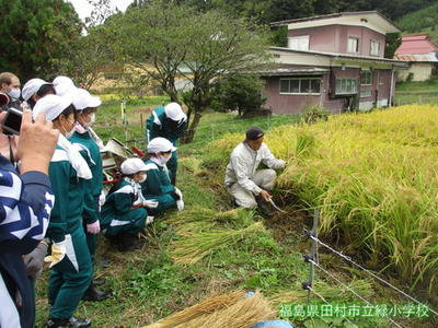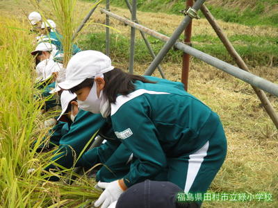 5校時目、5、6年生がみんなで稲刈りをしました。