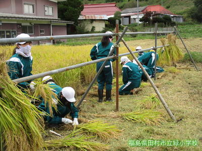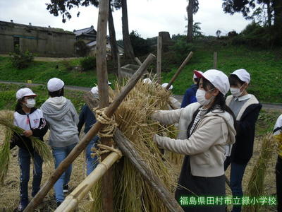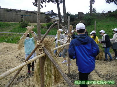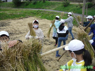 今日5・6年生が、先週稲を刈った田んぼで、稲刈り後の作業を行いました。稲が良く乾くようにするそうです。