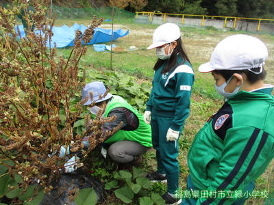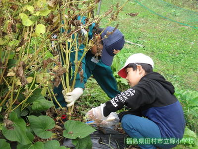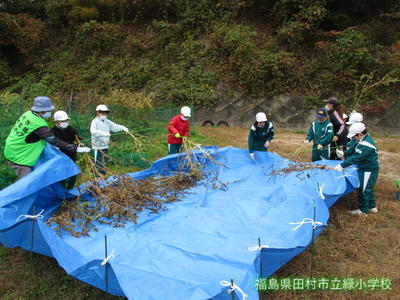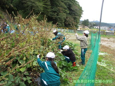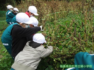 昨日、3・4年生が、育ててきた「エゴマ」の刈り取りをしました。地域に住む学校支援ボランティアの方にご指導、ご協力をいただきながら、作業を進めました。