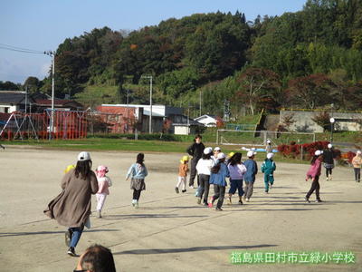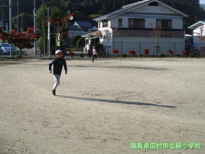 赤や黄色に色づいた木々の中を、今朝も緑っ子のみんなは、元気いっぱいに走っていました。