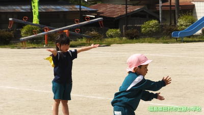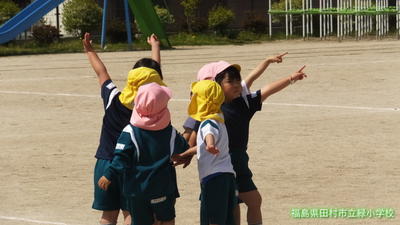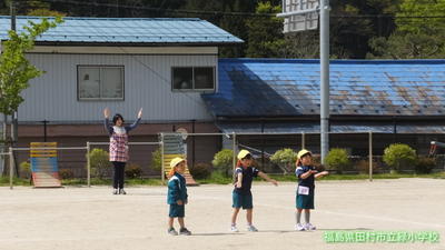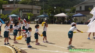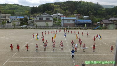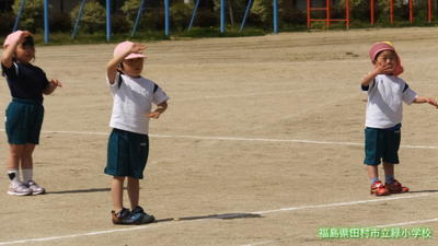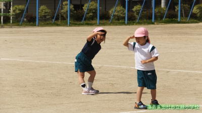 幼稚園児は、広い校庭で、のびのびと踊りました。