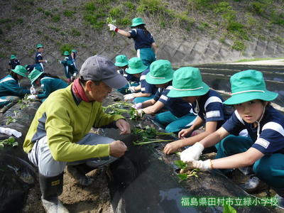 「絆の桜」で人と地域をつなぐ ~緑小学校には「絆の桜」と名付けられた桜の木が学校の周りにたくさん植えられています。子どもたちは、自分が受け継いだ桜の木を6年間かけて世話し、観察していきます。6年生が卒業すると、その桜は新1年生が受け継ぎます。6年生から1年生へ、人と人をつなぎ、人と地域もつなぐ「絆の桜」を子どもたちは今日も大事に育てています。~