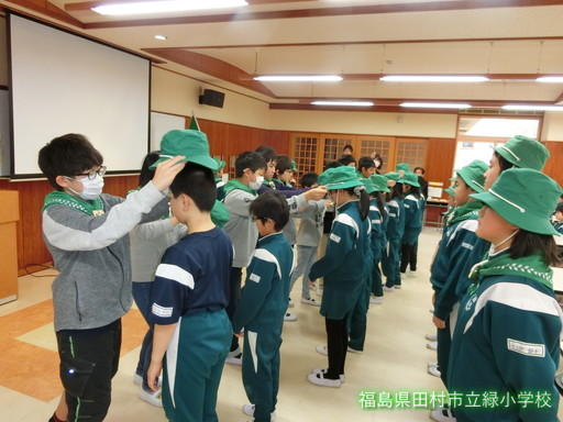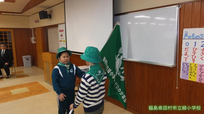 団長から新団長へ団旗が、6年生から下級生へ緑の帽子が渡されました。