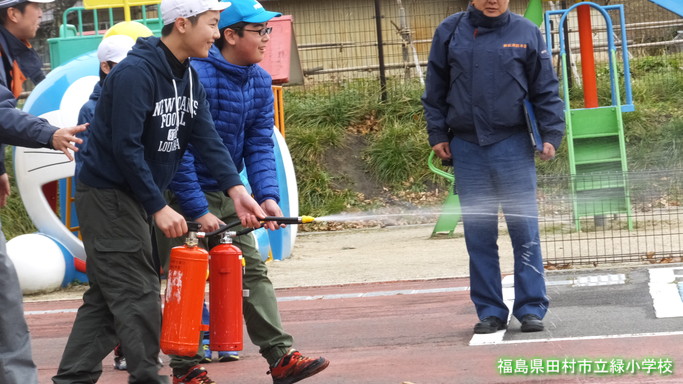 代表の5・6年生が消火器を操作するところを全校生で見て、操作の仕方を覚えるようにしました。