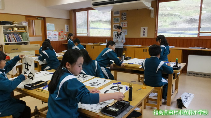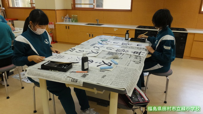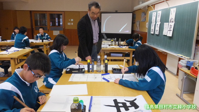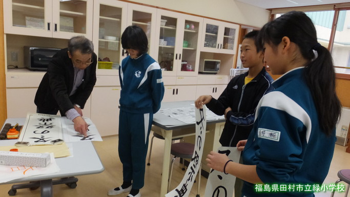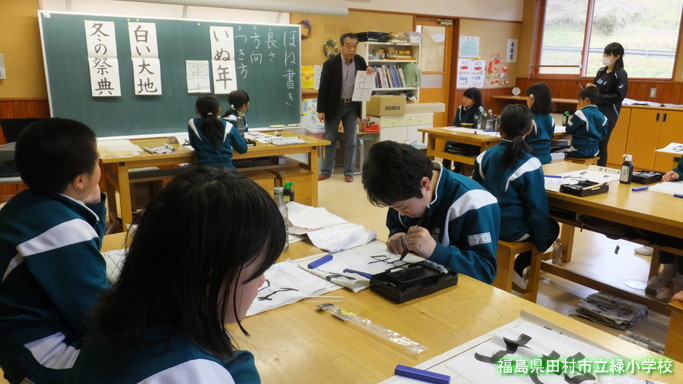 書写指導の先生をお迎えし、3,4,6年で書き初めの学習を行いました。