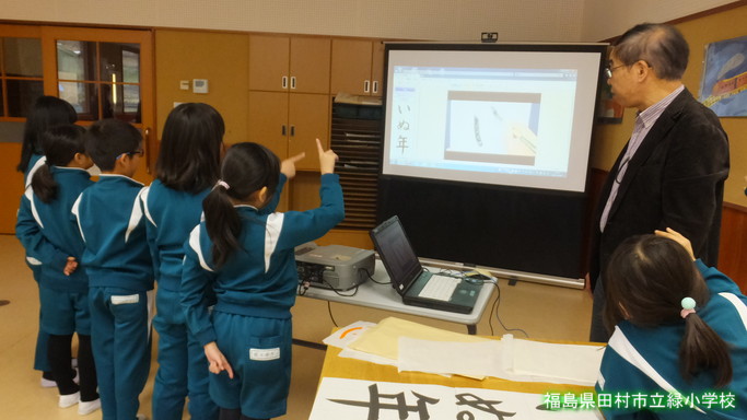 2017年12月5日 11時41分 書写指導の先生をお迎えし、3,4,6年で書き初めの学習を行いました。
