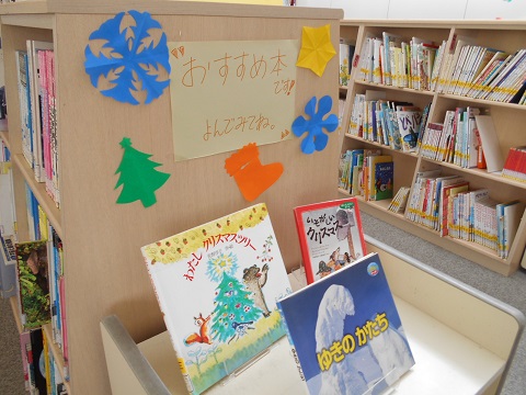 毎月、図書ボランティアのみなさんに、図書室の読書環境整備を行っていただいております。今回は冬ならではの読み物を整えていただきました。飾りも冬模様です。冬休み前のまとめの時期になり、何かと忙しい日々ですが、落ち着いた静かな環境で読書に親しませたいと思います。