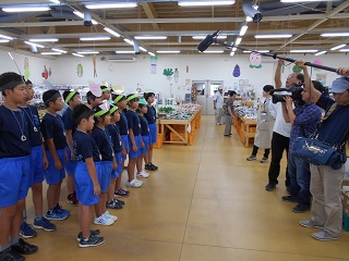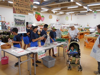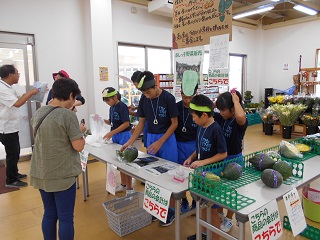 8月31日、今日は「野菜の日」です。芦沢小学校5・6年生は、自分たちで育てた、にんじんやごぼう、じゃがいも、ズッキーニ、ピーマン、モロヘイヤ、かぼちゃなどの野菜を「ふぁせるたむら」さんの店頭で販売体験をさせていただきました。春に種や苗を植え、水を与え間引きをしながら育て、そして収穫の喜びを味わうことができました。今日の販売のために、野菜の袋詰めや値札付け、ポスター作成などを子ども達が協力して行いました。そして販売体験スタート。店内には、「いらっしゃいませ。」「おいしい野菜ですよ。」「わたしたちが育てました。」の声が響いていました。結果は完売でした。これらの経験を通して、「目標をもって最後までやり遂げる意欲」を育てていきたいと思います。