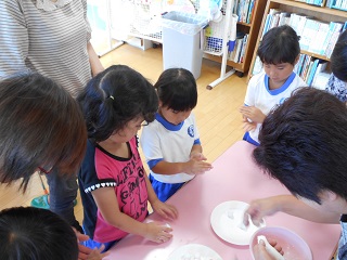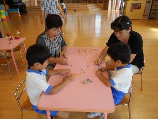 今日、芦沢幼稚園では「祖父母参観」を行いました。お家の方々といっしょに、お手玉や竹とんぼ、おはじきなどで遊んだり、月見だんごを作って会食したりしました。あたたかい雰囲気につつまれ、みんな笑顔で楽しい時間を過ごすことができました。