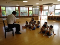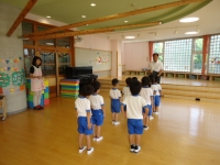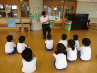 幼稚園では「始まりの会」が行われ、園長先生が絵本の読み聞かせを通して、お友だちとなかよく、楽しくすごしていくことの大切さについてお話いただきました。子どもたちのお話を聞く姿勢もすばらしかったです。