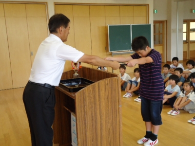 小学校の全校集会では、校長先生からお話がありました。まず、夏休み中に行われた市水泳大会や少年の主張大会でのあしっ子の活躍について紹介されました。次に、夏休みに入る前に校長先生と約束したことの確認があり、どの子もしっかりと守れていました。最後に、リオデジャネイロオリンピックについてのお話がありました。そして「あきらめずに最後まで努力することの大切さ」と「読書やマラソン、漢字の勉強など何でもいいので、学校生活の中で、自分が一番だというものをめざしてがんばってほしい。」というお話がありました。