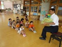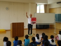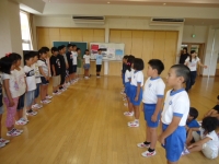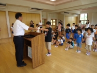 生徒指導の先生からは、4つの色(赤・白黒・白・水色)から連想することを通して「火」「水」「事件、事故」「病気やけが」に注意することを、保健の先生からは、歯みがきをきちんとやることや手洗いうがいの励行、おやつのとり方等についてのお話がありました。児童も園児もしっかりと話しを聞く姿がすばらしかったです。楽しい思い出いっぱいの夏休みにして8月25日には全員元気に登校してほしいと思います。