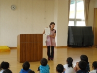 というお話がありました。幼稚園では、絵本「14ひきのあさごはん」の読み聞かせを通して、早起きをしてしっかり朝ごはんを食べて元気に生活しましょう。というお話をしていただきました。