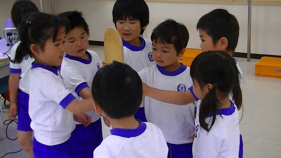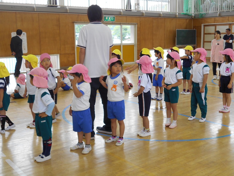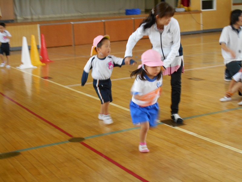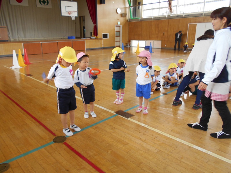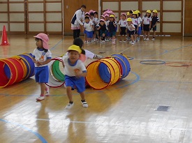 今日は第2回交流保育の日です。今回の会場は船引南幼稚園さんです。緑幼稚園さんと本園が合流して交流保育が始まりました。まずは体育館で運動です。最初はリレーを行いました。前回のリレーの反省を生かして、今日はルールをしっかりと覚えての参加です。みんな上手にバトンパスができるようになりました。続いては、トンネルくぐりです。手と足をうまく動かしてくぐることができました。