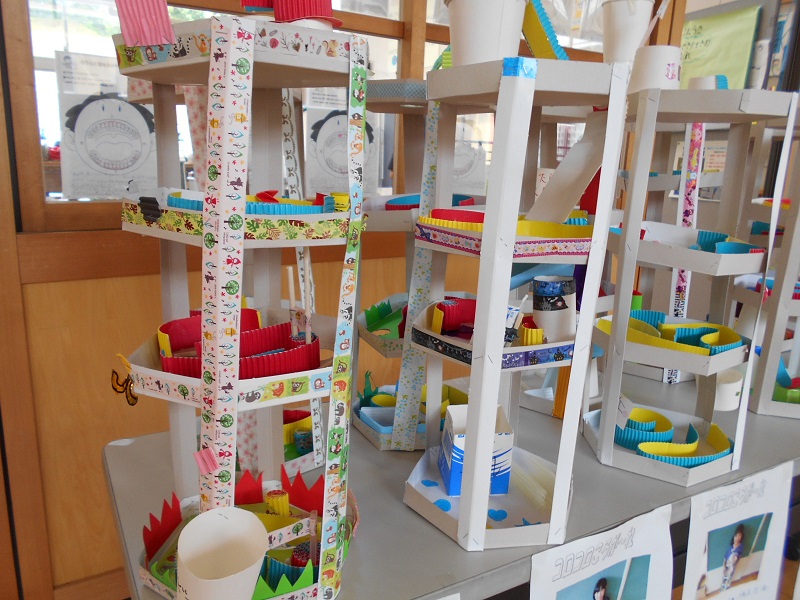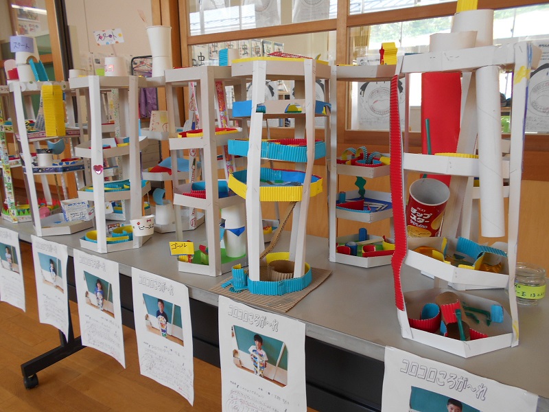 4年生図画工作の大作、ビー玉「コロコロころがーれ」。スタートしてゴールにたどり着くまでには、たくさんの難関があります。上り坂や下り坂、あながあったり、ジグザグになっったりと工夫がたくさん。さて、クリアめざしてトライです。