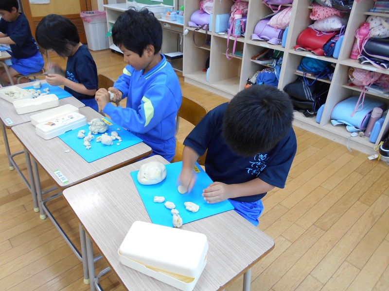 3年生の図画工作では、ねんどで「切って かき出して くっつけて」の作品を作成中です。ねんどのかたまりを自分の思った形にするまでには、力をこめてこねたり引っ張ったりと、全身をつかってがんばっています。さあ、大作を期待しています。