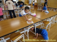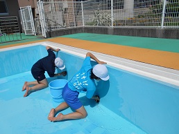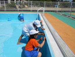 芦沢小学校5・6年生と船引南小学校5・6年生の児童が合同で、船引南小学校のプールを清掃しました。今年度も芦沢小学校は船引南小学校のプールを利用します。プールの内部は昨日のPTA奉仕作業のご協力により、よごれはかなり落ちていましたので、子どもたちは更衣室やプール側面などを掃除しました。